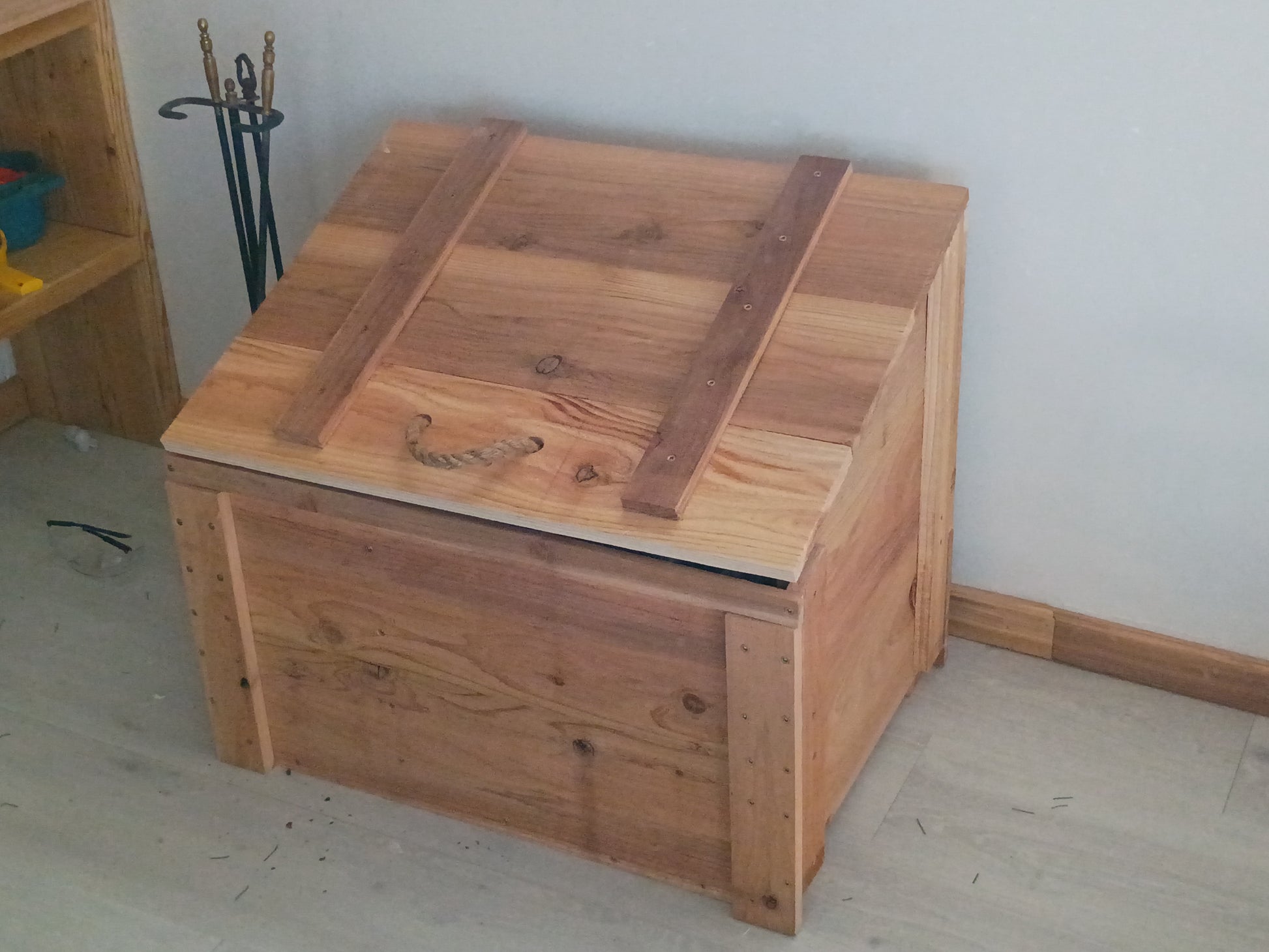 Cedar firewood crate, complete with a rope handle for that rustic style. The storage crate has two compartments, one for storing standard firewood of 16 inches and the other compartment is just over 7 inches for storing kindle and scrap wood. This can be used inside or outside. The entire piece stands at 2ft x 28in x 20in. with a half inch space between the front and back to allow air to flow under the crate.